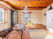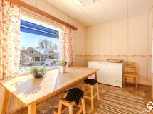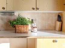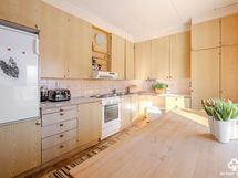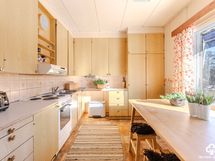 - Keittiön varusteet: Jääkaappi, liesituuletin ja liesi. Liesi: Sähköhella. Työtason materiaali: Laminaatti.