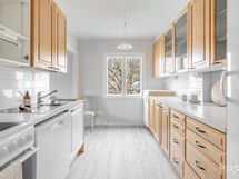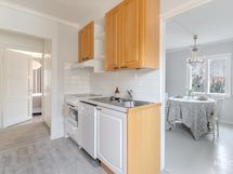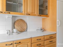 - Keittiön varusteet: Liesi, jääkaappi, erillinen pakastin, uuni ja mikroaaltouuni. Työtason materiaali: Laminaatti.