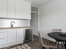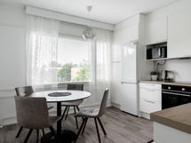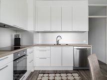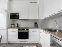 Keittiön varusteet: Jääkaappipakastin, liesituuletin, liesi, uuni ja astianpesukone. Liesi: Keraaminen liesi. Työtason materiaali: Laminaatti.