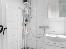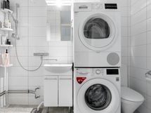 Pesutilojen varusteet: WC-istuin, suihku, allaskaappi ja pesukoneliitäntä.