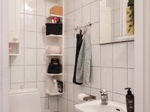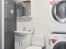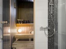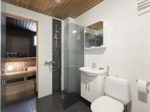 - Sauna lasiovi, lauteet, ikkuna, sähkökiuas, kylpyhuone suihku, suihkuseinä, pesukoneliitäntä, erillinen wc peili, lavuaari, wc-istuin.