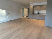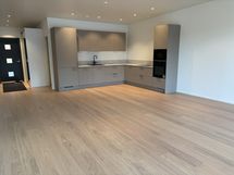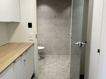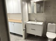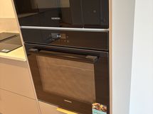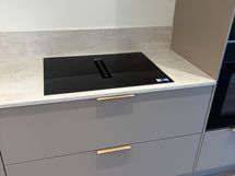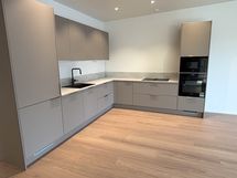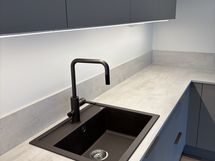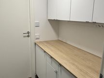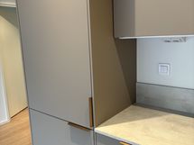 - Keittiö Puustelli, induktioliesi, tasotuuletin, integroitu JK/PK ja APK, erillisuuni, mikro, laminaattityötasot, komposiittiallas, Oras Optima keittiöhana, led valonauha yläkaappien alapinnassa