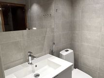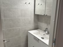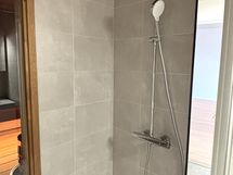 - Lattia ja seinät laatoitettu, katto puupaneelia (lämpökäsitelty), valkoinen kaluste, valumarmoriallas, Oras Optima vesikalusteet, sadesuihku, suihkuseinä, wc-istuin Ido . WC: Lattia ja seinät laattaa, valkoinen kaluste ja allas, Oraksen hana