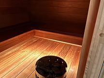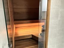 - Lattia laattaa, seinät lämpökäsiteltyä puuta, kiuas Harvia Cilindro, led-valaistus istuinlauteen alapinnassa