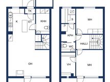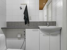 - Pesutilojen varusteet: Suihku, lattialämmitys, wc-istuin, peili, bidee-suihku, allaskaappi ja pesuallas.