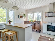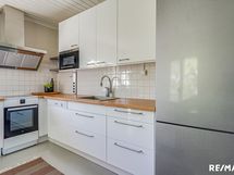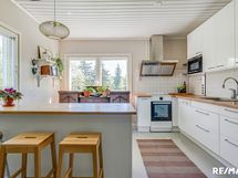 - Keittiön varusteet: Jääkaappipakastin, astianpesukone, uuni, liesi, liesituuletin, keittiösaareke ja mikroaaltouuni. Liesi: Induktioliesi. Työtason materiaali: Laminaatti.