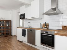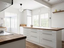 - Jääkaappi, pakastekaappi, erillisuuni 2025, liesitaso 2025, induktioliesi, liesikupu, astianpesukone, kaapistot, irralliset saarekkeet, pöytätasojen materiaali Täyspuuta.