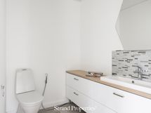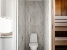 Kaksi suihkua, wc-istuin, kiinteät valaisimet.