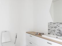 Laatikostot, laminaattitaso, allas, hana, bidee, peili ja wc-istuin (kaapin alla vesivuotovahti).