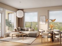 Ikkunat kahteen suuntaan ja normaalia suurempi huonekorkeus saavat tämän kodin tulvimaan luonnonvaloa. Olohuone ja keittiö muodostavat avaran yhteisen tilan, jossa on helppo viettää aikaa perheen ja ystävien kanssa. Iltaisin ikkunoista avautuu näkymä puiston yli kohti auringonlaskua – hetki, joka tekee tästä kodista ainutlaatuisen.