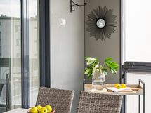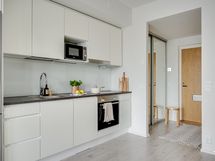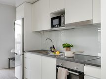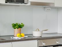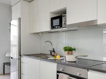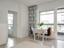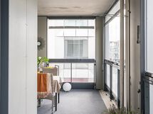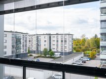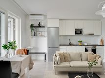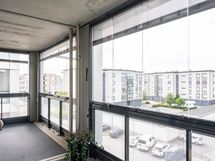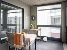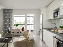 Olohuone ja keittiö muodostavat yhtenäisen kokonaisuuden, jossa suuret ikkunat tuovat tilaan avaruutta. Keittiö on varusteltu integroidulla astianpesukoneella, kalusteuunilla ja muilla käytännöllisillä ratkaisuilla, jotka tekevät ruoanlaitosta mukavaa. Olohuoneesta on suora käynti koko huoneiston levyiselle lasitetulle parvekkeelle - kuin toinen olohuone pitkälle syksyyn saakka.