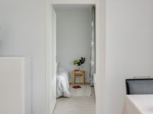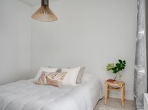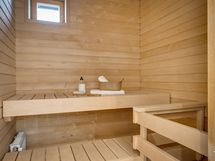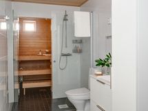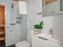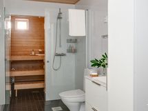 Makuuhuoneessa on käytännöllinen liukuovikaapisto, joka kätkee tavarat siististi säilöön. Kylpyhuone on laatoitettu kauttaaltaan ja varusteltu arjen helppoutta ajatellen: suihkuseinä, tilavaraus pesukoneelle sekä moderni allaskaapisto. Oman saunan lempeät löylyt kruunaavat asumisen nautinnon.