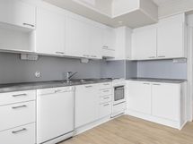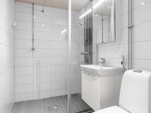 - Kylpyhuone, suihkuseinä, peilikaappi, allaskaappi, pesukoneliitäntä, lattialämmitys, kiinteät valaisimet.