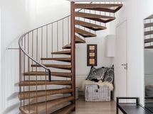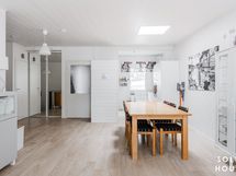 Asunnossa on kolme makuuhuonetta, joista yksi sijaitsee yläkerrassa. Tilava olohuone sekä sen kylkeen istutettu käytännöllinen moderni-ilmeinen tehokeittiö, joka on varustettu ajattoman tyylikkäillä kaapistoilla ja pääosin kalusteisiin integroiduilla kodinkoneilla. Kuvat eivät tee täysin oikeutta ruokailutilan ja olohuoneen avaruudelle ja valoisuudelle. Ruokailutilan kattoikkuna tuo viehättävällä tavalla auringonpaisteen keskelle asuntoa. Yläkerrassa on siistikuntoinen pikku wc. Helppokulkuiset kierreportaat johtavat alakerran tiloihin, askelmiin on asennettu turvallinen huopapinnoitus liukuesteeksi. Kellarikerrokseen on toteutettu kahden makuuhuoneen lisäksi yksi makuuhuonetila lisää yhdistämällä pukuhuone ja vaatehuone. Ikkunattomaan tilaan tuo valoisuutta ristikkolasiovi. Kellarikerroksessa on myös kodin pesuhuone saunoineen, sekä erillinen wc. Komerokaapistoja löytyy makuuhuoneista, sisäänkäynnin vieressä on lämmin varastotila.