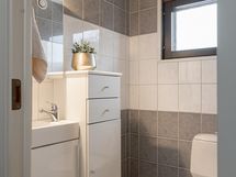 Yläkerrassa wc: wc-istuin, peili, lavuaari, allaskaapisto, kaapistot, ikkuna