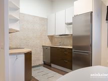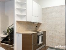 - Työtaso: laminaattitaso. Kaapistot, jääkaappi/pakastin, astianpesukone, liesituuletin, keraaminen liesi ( halkeama)