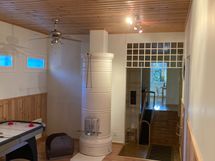 Alakerran tiloissa on iso autotalli, varasto/työtilaa ja kaukolämmön laitteet.