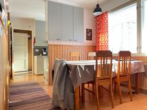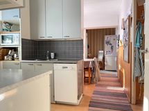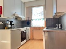 Keittiön varusteet: Jääkaappipakastin, liesituuletin, astianpesukone ja liesi. Liesi: Keraaminen liesi. Työtason materiaali: Laminaatti.