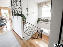 Tämä kuuden makuuhuoneen koti Kourujärvellä palvelee isompaakin perhettä. Sisääntulokerroksessa on neljä makuuhuonetta, wc/kodinhoitotila, pesuhuone, sauna sekä pukuhuone, josta kulku suojaiselle takapihalle. Yläkerrassa tilava olohuone, ruokailuhuone, keittiö, kaksi makuuhuonetta, vaatehuone, erillinen wc sekä wc / suihku. Tilavalle parvekkeelle kulku olohuoneesta sekä makuuhuoneesta.