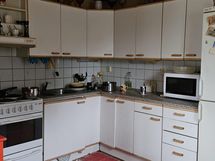 Jääkaappipakastin, sähköliesi, kaapistot.