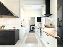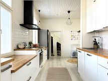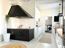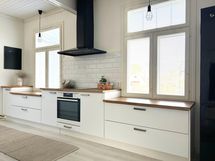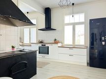 Upea remontoitu keittiö yhdistelee tyylikkäästi mustaa ja valkoista. Yhdistelmän kruunaa täyspuiset tasot. Talon historiasta muistuttelee tilan tunnelmallinen puuhella.