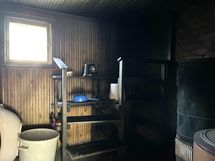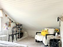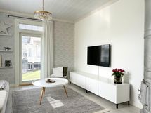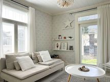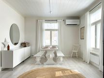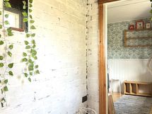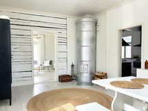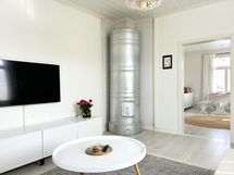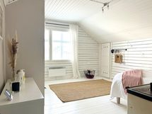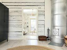 Keittiöstä astutaan valkoiseen huoneeseen, jossa pääosaa näyttelee esiin tuotu, valkoiseksi maalattu hirsiseinä. Kunniaa ansaitsee myös kaunis pystyuuni. Tila soveltuu niin ruokailu- kuin oleskelutilaksikin.