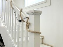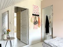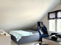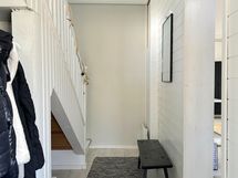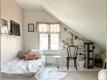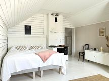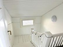 Eteistilasta nousevat valkoiset portaat johtavat yläkerran isoon makuuhuoneeseen. Yläkerrassa myös kaksi muuta makuutilaa sekä vaatehuone.