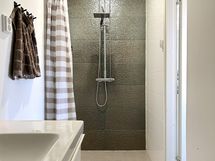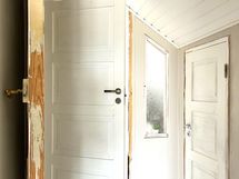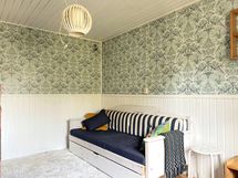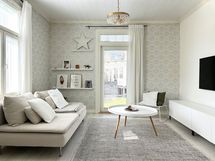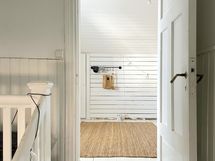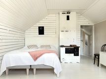 Seuraava huone jatkaa kodin tunnelmaa hillityllä, vaalealla värimaailmalla. Tässäkin huoneessa komeilee pystyuuni, ja kauniit pariovet kutsuvat astumaan ulkoilmaan. Tämäkin tila muokkautuu oleskelutilan lisäksi vaikka makuuhuoneeksi.