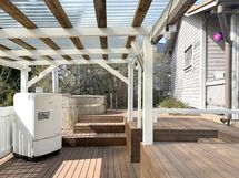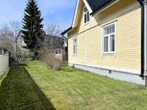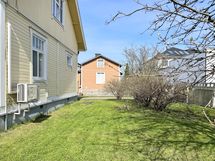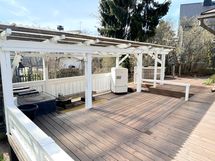 Kodin pihapiiri on tilava ja hyvin suojaisa. Isolla terassialueella voit paistaa makkarat, nauttia auringosta ja vaikka pulahtaa paljuun. Pihasaunaan kuljetaan tämän terassin kautta. Pihasaunan yhteydessä myös viihtyisä ns. kesähuone. Piharakennuksessa lisäksi puuvaja sekä autotalli.