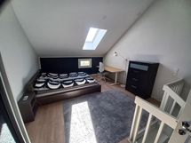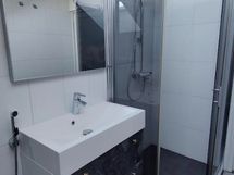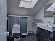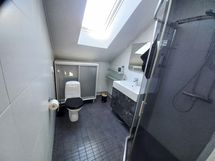 Pesutilojen varusteet: Suihkukaappi (Yläkerran pesutilassa), lattialämmitys (Yläkerran pesutilassa, Alakerran pesutilassa), suihku (Alakerran pesutilassa), pesukoneliitäntä (Alakerran pesutilassa), pesuallas, allaskaappi ja wc-istuin (Yläkerran pesutilassa). Erillisten WC:n lukumäärä: 2.