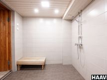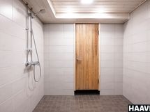 Alakerrasta löytyy kodin kolmas makuuhuone sekä toinen olohuone, josta kulku suojaisalle takapihalle. Saunaosaston tilavasta pukuhuoneesta on käynti vuonna 2020 remontoituun kahden suihkun kylpyhuoneeseen sekä saunaan. Yhteinen uima-allasosasto naapurihuoneiston kanssa, joka ei ole käytössä tällä hetkellä. Tilassa myös kodinhoitohuone/varasto, vaatehuone ja erillinen wc. Asunnon vieressä oleva autotalli on yhteinen naapurin kanssa, jossa molemmille omat autopaikat.