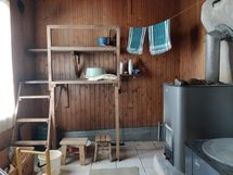 Kiuas: Puukiuas. Saunan yhteydessä peseytymistila. Kylmä vesi tulee käsipumpulla kaivosta saunaan. Saunassa on pata veden lämmittämiseen.