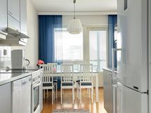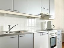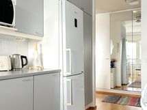 Keittiön varusteina uusittu jääkaappipakastin, keraaminen liesi, liesituuletin ja astianpesukone.