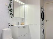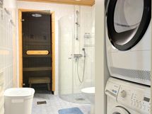 Avaraa saunaosasto tarjoaa tilat suihkulle, wc:lle ja pyykkihuollolle. Mukavasti säilytystilaa. Suihkuseinät uusittu hiljattain.