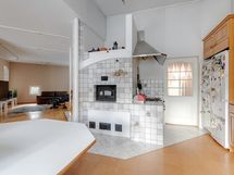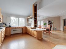 - Keittiö ja ruokailutila muodostavat tilavan ja avaran kokonaisuuden yhdessä olohuoneen kanssa. Keittiössä leivinuuni, jää- ja pakastekaappi, keraaminen liesi, liesituuletin, astianpesukone sekä kaapistot ja laminaattitaso.