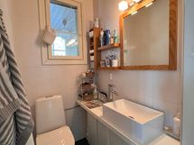 Yläkerran kylpyhuoneessa on wc-istuin, suihku sekä kylpyamme. Erillisten WC:n lukumäärä: 1. Erillisen WC:n varusteet: WC-istuin, pesuallas, peili, allaskaappi ja bidee-suihku. Erillisen WC:n kuvaus: Alakerrassa on erillinen wc. Yläkerran kylpyhuoneen yhteydessä on toinen wc-istuin.
