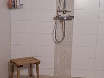Lattia on laatoitettu ja seinät on kaakeloitu. Pesukoneliitäntä. Lattialämmitys.