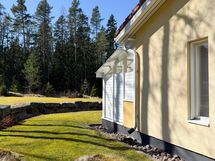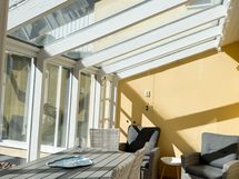 - Talon molemmat terassit ovat lännen suuntaisia. Lasiterassi on osittain katettu (n. 10m2) ja jatkuu ulkoterassina (n. 6m2). Lasiterassilla on lattialämmitys, lämpölasit, viemärikaivo, sähköt ja vesipistevalmius.