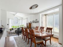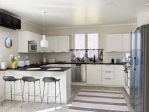 - Keittiön varusteet: Jääkaappi, erillinen pakastin, viinikaappi, liesi, erillisuuni, astianpesukone ja liesituuletin. Liesi: Induktioliesi. Työtason materiaali: Laminaatti.