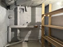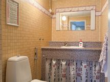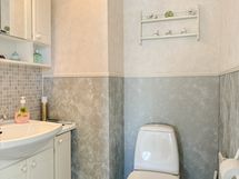 Pesutilojen varusteet: Suihku, pesukoneliitäntä ja pesuallas. Pesutilojen kuvaus: Kylpyhuone sekä sauna sijaitsevat yläkerrassa. Erillisten WC:n lukumäärä: 2. Erillisen WC:n varusteet: WC-istuin, pesuallas, bidee-suihku, allaskaappi ja peilikaappi.