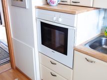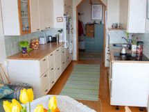 - Tilaa isolle ruokapöydälle, Paljon kaappitilaa, Paljon työskentelytilaa, Puutasot, astianpesukone, keraaminen liesi, liesi tai uuni erikseen, jääkaappi, pakastin. Tasot pyökkiä. Kiertoilmauuni hyvällä korkeudella. Laatikostot (ei kaapit).
