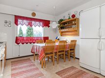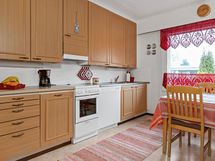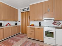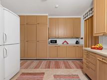- Jääkaappi, jääkaappipakastin, keraaminen liesi, liesituuletin, leivinuuni takkahuoneessa, astianpesukone, kaapistot, kiinteät valaisimet, pöytätasojen materiaali laminaatti.