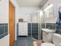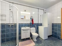 - Pesutilojen varusteet: WC-istuin, suihku, suihkukaappi, pesukoneliitäntä, peilikaappi, allaskaappi, bidee-suihku ja pesuallas.