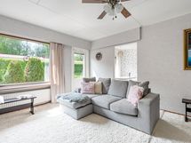 - Olohuoneesta ja keittiöstä näkymä terassille, makuuhuoneesta ja saunasta näkymä etupihalle.