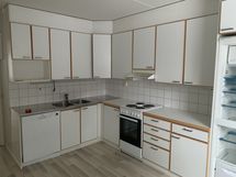 Tilaa isolle ruokapöydälle, Paljon kaappitilaa, Suuri tiskipöytä, Laminaattitasot, Terästasot, Astianpesukone, Sähköliesi, Liesituuletin, Jää-pakastinkaappi