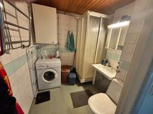 Suihku, suihkukaappi, peilikaappi, kaapit, allaskaappi, pesukoneliitäntä, kiinteät valaisimet. pyyhepatteri