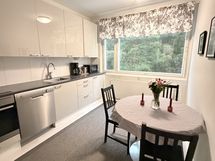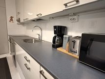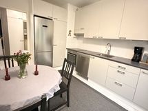 Liesi: sähköliesi. Työtasot: laminaatti. Kylmäsäilytys: jääkaappi/pakastin. Varustus: liesituuletin, astianpesukone.