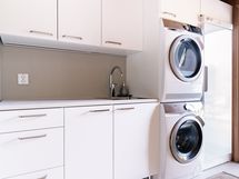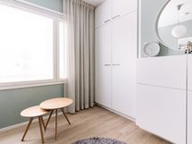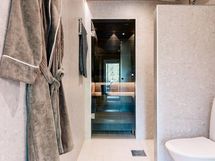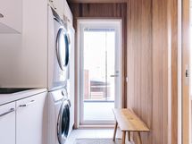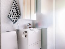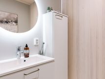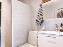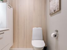 - Pesutilojen varusteet: WC-istuin, suihkuseinä, suihku (Sadesuihku), peilikaappi ja allaskaappi. Pesutilojen kuvaus: Kodinhoitohuoneen ja pesuhuoneen välissä lasinen liukuovi, kuten liukuovi on myös olohuoneen suuntaan. Erillisten WC:n lukumäärä: 1. Erillisen WC:n varusteet: WC-istuin, allaskaappi, bidee-suihku ja peili.