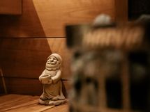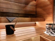 - Kiuas: Sähkökiuas. Saunassa lämpökäsitelty haapa ja takaseinää koristaa sormipaneeli. Harvia -pilarikiuas.