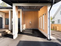 Etupihan puolella sähköauton latauspistokkeella varustettu autokatos sekä kaksi erillistä autopaikkaa.